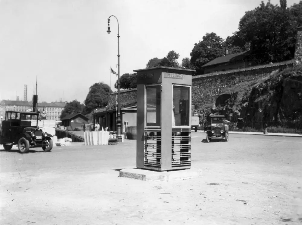 The first red telephone box in Oslo, 1933. Oslo telefonanleggs arkiv/Telemuseet