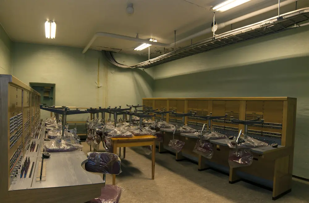 Innerst i bunkersen er telefonistinnenes arbeidsrom, utstyrt med 15 sentralbord. Rommet er ikke stort, og bare tanken på den hektiske aktiviteten som ville utspilt seg her nede, lokker på migrene. Hvorfor valgte Telenor å legge alarmsentralen akkurat her, mon tro?