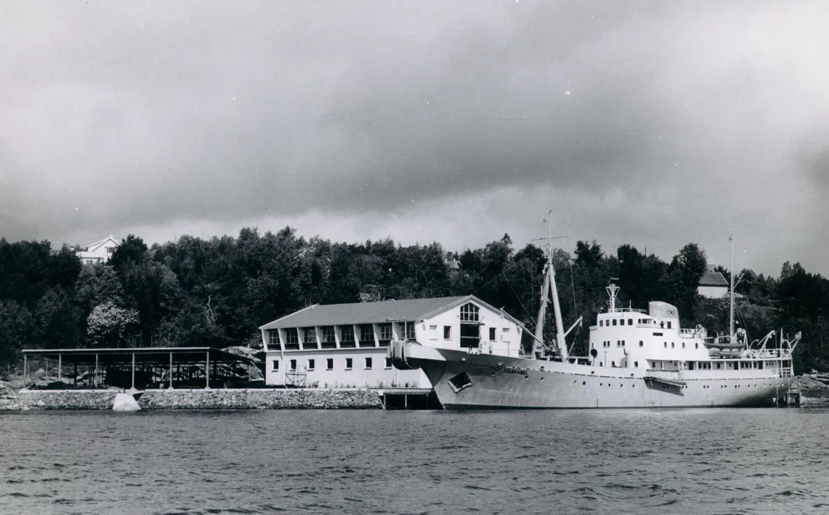 Kabelskip til kai utenfor Dolviken sjøkabellager, 1960-årene Ukjent/Telemuseet - 2/3